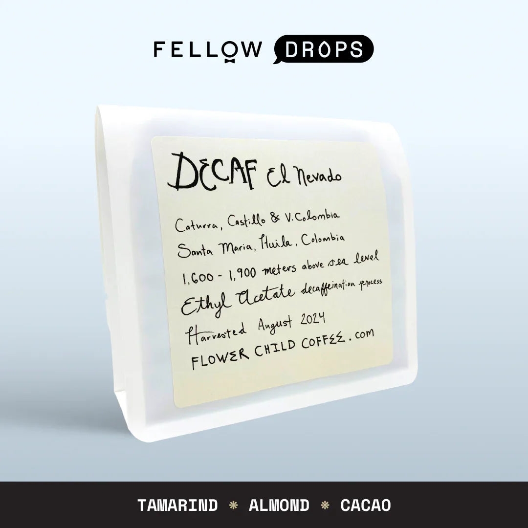 This coffee is named for Nevado del Huila. Colombia’s highest volcano. It was decaffeinated using ethyl acetate. a naturally occurring fruit compound that works particularly well to preserve flavor. We tasted tamarind. almond. and cacao.